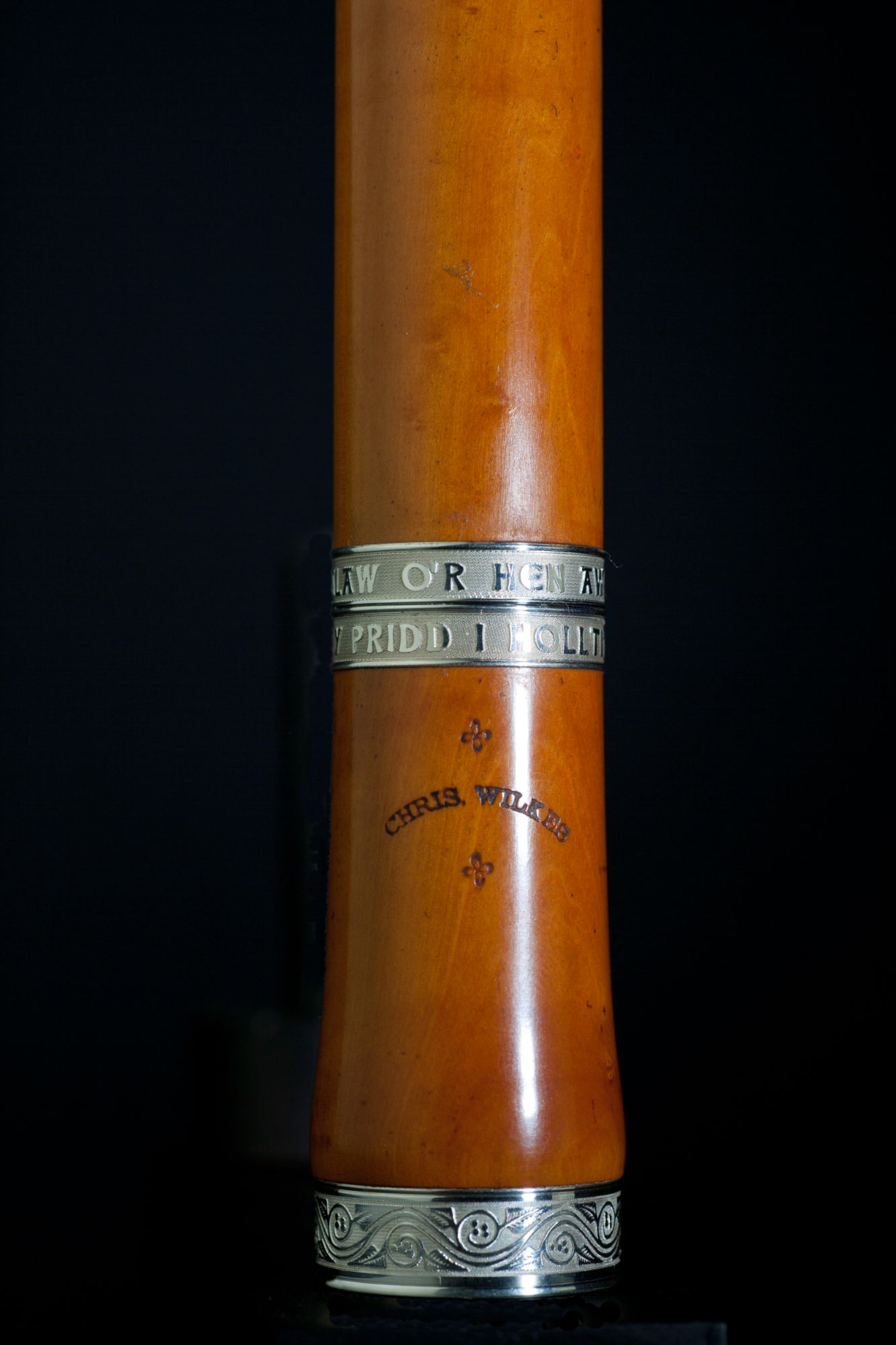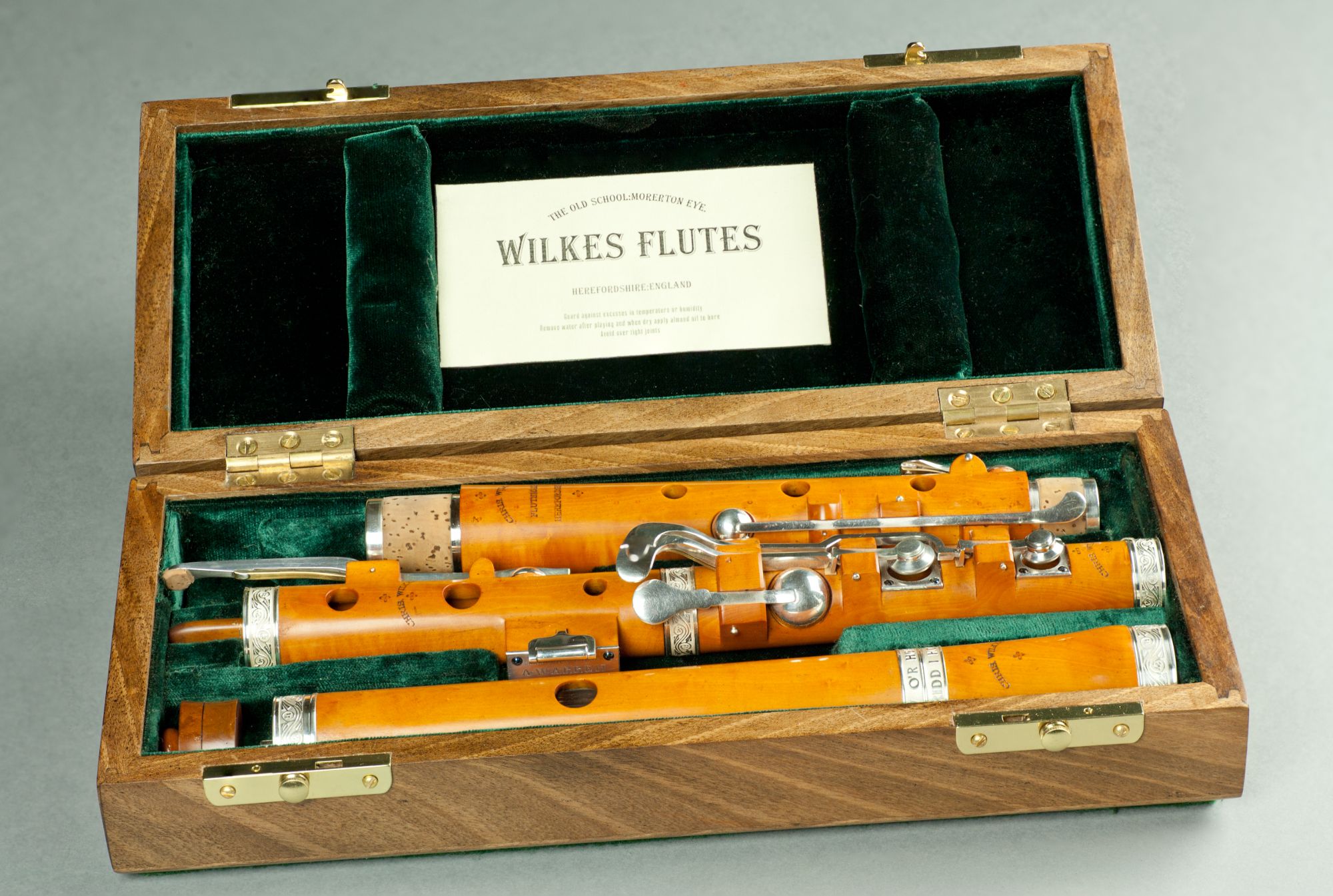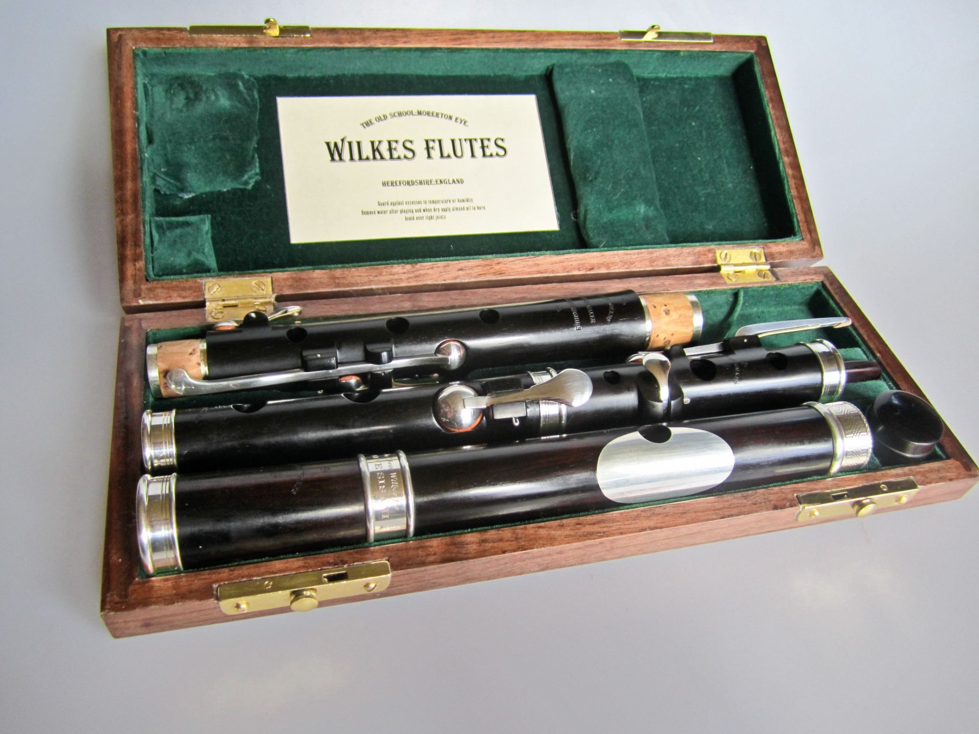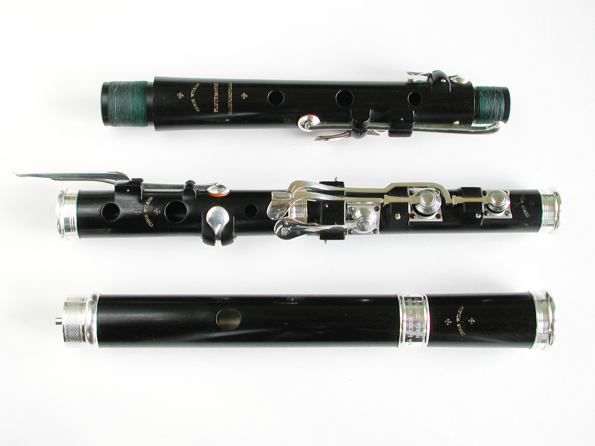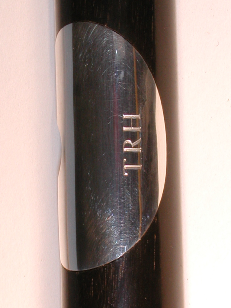 These include larger silver bands and end caps, either engraved or plain; silver lip plates, tenons, sockets, tone holes and key block linings; left handed and pin mounted flutes, and non standard key work including various trill and roller keys.